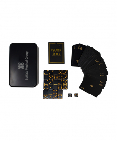 Pass the time with our portable games kit! Included in this customizable gift tin are luxe dominoes, dice, and playing cards. This kit is easy to bring with you on road trips or flights for games night no matter where you are. 4.1" W x 6.7" L x 3.2" H